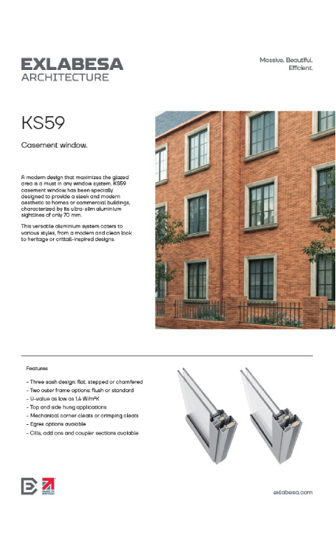 KS59 gives versatility thanks to its wide range of sections which include flat, stepped or chamfered options allow for the creation of a spectrum of styles, ranging from modern and minimalist aesthetics to heritage and industrial casement designs. This aluminium system provides an extensive array of accessories and complements, encompassing Georgian bars, cills, trickle vents, bay pole, 90º corner, and flush add-ons of 20 and 40 mm.